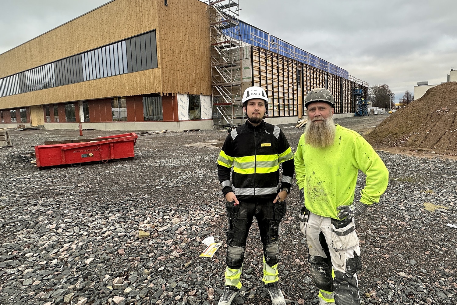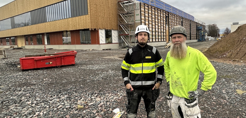 Henning Pålsson och Billy Kandell framför nya sporthallen.